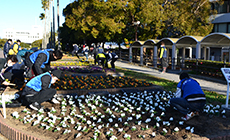 徳島グループは集合写真を撮影後、小グループに分かれて公園内の花壇、歩道や中央分離帯の花壇などにパンジーなど色とりどりの花株をきれいに並べて植え付けました。