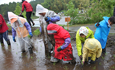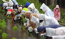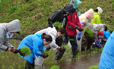 「阿蘇水掛の棚田」における稲作ボランティア(田植え)