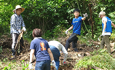 繁殖力の強い孟宗竹(もうそうちく)が土中の養分の大部分を吸収し、日光を遮ることで周囲の樹木が枯れてしまう被害を「竹害」と言います。 この活動は「竹害」を受けている緑地の一角を本来の森に再生し、二酸化炭素排出量の削減と生物多様性保護の推進のために里山化することを目的としたものです。