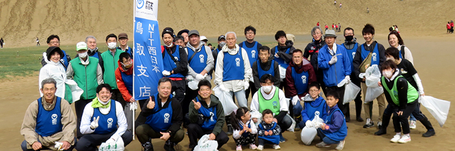 2023年4月16日(日)、NTT西日本鳥取グループの社員とその家族など総勢80名は鳥取砂丘美化運動協議会が主催する、春の「鳥取砂丘一斉清掃」に参加しました。