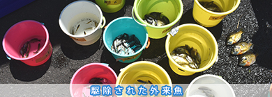 駆除した外来魚は自然公園内に設置されている外来魚回収ボックスに集められ、その後は魚粉に加工されます。その魚粉は、隣接する生態系保存資料館「アクアイム」に展示されている魚の餌や藺牟田池周辺の草花の肥料となります。