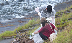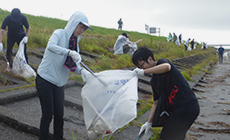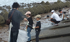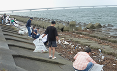 当日は時折小雨が降る空模様でしたが、参加者はぬかるみ滑りやすくなっている足元に注意を払いながら、波消しブロックの隙間などに漂うペットボトルなどの投棄ごみを収拾しました。