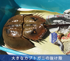 ごみを拾いながら行った観察会では、皆で懸命にカブトガニを探して運よく生きたカブトガニを見つけた人もいたのですがその場でリリースし、抜け殻を拾った人は許可を得て記念に持ち帰らせていただいていました。