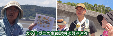 活動には家族連れで参加された方も多く「初めて生きたカブトガニを見た」という感動の言葉や「海にはいろいろな所からごみが流れ着いているという悲しい現実を目の当たりにし、驚きを感じた」などの率直な感想をいただきました。
