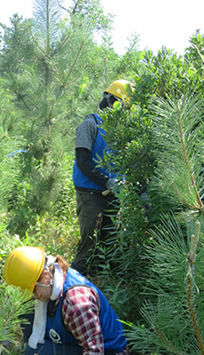 参加者の方々は汗だくになりながらも一生懸命に雑草を刈り取った甲斐もあって、作業前は植栽したクロマツが鬱蒼と生い茂る雑草に隠れて見えませんでしたが、活動を終える頃にはしっかりと確認できるようになりました。