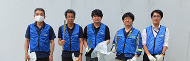 徳島支店ビルでは、仕事を終えた社員たちが揃いのブルーのビブスを着用し、ビニール袋とハサミを手に街へと向かい、約1時間の活動で可燃ごみ、不燃ごみ、缶、ペットボトルなど、合計で約13キログラムのごみを拾い集めました。