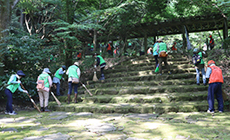 オリエンテーションの後、参加者は鎌やほうき、熊手等を持ち、遊歩道周辺の下草刈り、枯葉清掃を行いました。