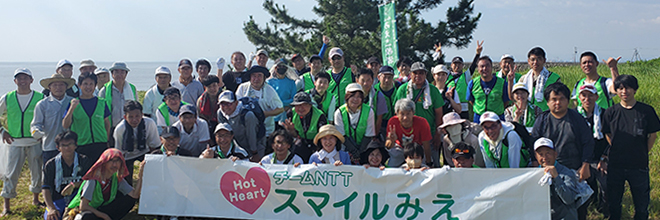 この活動は、毎年7月第3月曜日の祝日「海の日」の前に実施される「海と川を美しくする運動」で、NTT西日本三重グループは2018年から「みどりいっぱいプロジェクト」の一環として毎年参加しています。