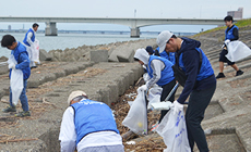 滑りやすくなった吉野川の堤防(土手)に立った参加者たちは、足元に気を配りながら、一歩一歩慎重に進み、流れ着いた木くずや波消しブロックの間に挟まったペットボトル、小さなごみまで丁寧に拾い集めました。