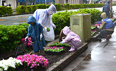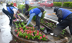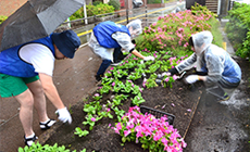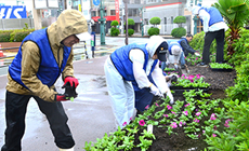 式典後には、市内の公園や沿道、中央分離帯の花壇など各持ち場に分かれ、スコップや熊手を手に花植え作業に取りかかりました。