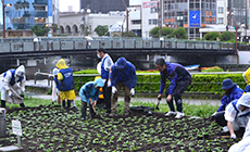 当日は朝から小雨が降るあいにくの空模様の中、中止を心配する声も上がっていましたが、主催であるNPO法人新町川を守る会理事長の「このくらいの雨は花植えにはちょうどいい」という力強い一言で、予定どおりの開催が決まりました。