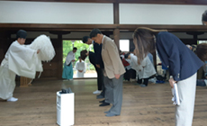 続いて上賀茂神社の高井宮司より、神社と葵祭の由緒について興味深いお話しをいただきました。また、参加者は普段入ることのできない権殿を参拝させていただき、荘厳な雰囲気を体験しました。