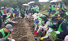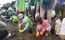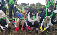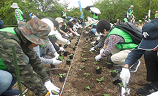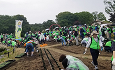 皆さまの協力のもと、夏の風物詩ともいえるヒマワリの苗1,776株を、お花畑一面に無事植え付けることができました。