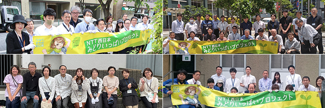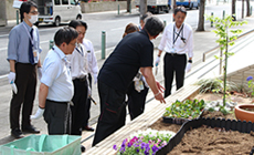 今回は新たに湊川ビルが加わり、神戸中央ビル、新神戸ビル、神戸駅前ビルとあわせて市内4つのビルで実施しました。NTT西日本兵庫支店長をはじめ、約80名の社員が、神戸市から届いたペチュニアやベコニアなどの夏花を丁寧に植え付けました。