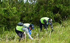 最初に松の特性の説明があり、手鎌の使い方や巻き付いたツルの落とし方を習いました。活動場所には、植樹から三年経った松が植えられており、根元には雑草が覆いかぶさっていました。広い場所は草刈り機を使い、松に近いところの雑草は手で刈っていきました。