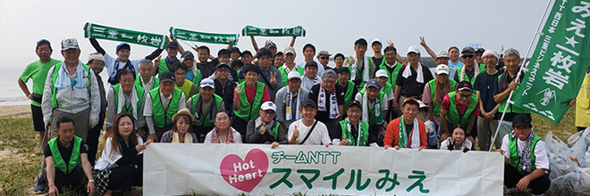 2025年7月5日(土)、津市白塚海岸にて実施された三重県漁業協同組合主催の清掃活動「海と川を美しくする運動」に、NTT西日本三重グループからは社員とその家族、退職者の58名が参加しました。