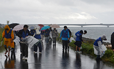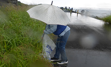 雨で濡れて滑りやすくなった土手の斜面は非常に危険なため、無理をせず道路上のごみ収集に範囲を限定し、約600メートルの受け持ちエリアを全員で作業を進めました。