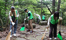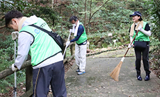 参加者は、ほうきや熊手、鎌などを手に、遊歩道周辺の下草刈りや枯葉の清掃を行い、里山の保全活動に取り組みました。