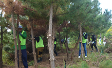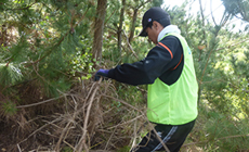 生長が乱れている木は倒れやすく、安全に作業を進めるために道具の使い方や生息地や松の特性を教わった後、手ノコを使い不要な枝を切り落としていきました。繁茂した枝葉をおろし、枝同士が交差して絡み合っているのを解消させ、樹木のバランスを整えていきました。