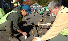 慣れない作業も、何度もボランティアに参加している社員にコツを習い、およそ100本の原木に種を埋め込むことができました。