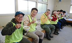 1時間半の作業も無事に完了し、参加者は恒例となったナメコや旬の野菜がたっぷり入った温かいめった汁をいただきながら、お互いの労をねぎらいました。