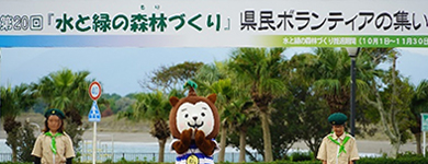 式典では宮崎県知事による挨拶や緑化功労者の表彰が行われ、続いて宮崎県のゆるキャラ「みやざき犬 むぅちゃん」と一緒に準備体操を行った後、県内から集まった約450名のボランティアが森林の枝打ちや下草刈りに取り組みました。