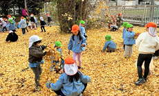 地域の子どもの笑顔溢れるビル敷地のイチョウ落ち葉拾い