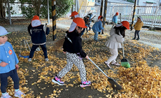 子どもたちはそれぞれ、小さなほうきを手に夢中で落ち葉をかき集めたり、両手いっぱいにかかえたりして、笑顔でたくさん遊びながらお掃除を頑張りました。