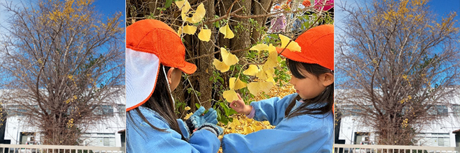 当日は冬の澄んだ青空のもと、先生と約60名の子どもたちが目をきらきらさせながら、金色の落ち葉がふかふかのじゅうたんのように広がったイチョウの木の前に集まりました。