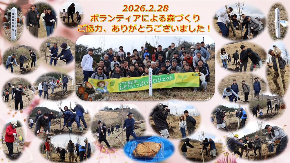 2026年2月28日(土)、大分県民の森・平成森林公園内「さくら園」において、「第30回ボランティアによる森林づくり」(主催:森林ネットおおいた)が開催され、NTT西日本 大分グループの社員およびその家族、約50名が一般ボランティアの皆さんとともに参加しました。