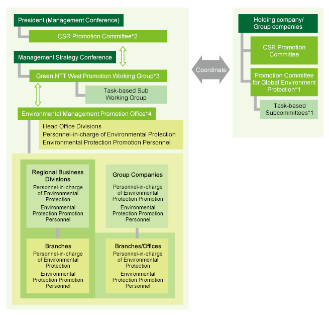 • *4 While coordinating with NTT Group companies, as the administration office of the Green NTT West Promotion WG, the Environmental Management Promotion Office examines environmental policies and measures of the NTT West Group, deploys policies and measures, and shares the progress with NTT West Group companies.