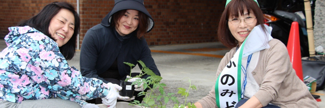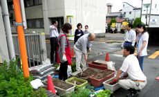 As with last year, NTT West Gifu Group held an activity on May 15 and 19, 2015 to build a "green curtain" by planting creepers at three NTT buildings of the Gifu Business Unit (Kano Building, Umegae Building and Kitamachi Building).