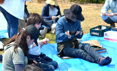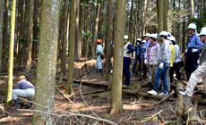 At the thinning activity using a handsaw, participants of each group worked together to cut down Japanese cypress trees, a task that requires considerable physical effort. All the team members helped each other to carry out the task with experienced participants working on it skillfully while at the same time sharing tips on the techniques with the first-timer participants.