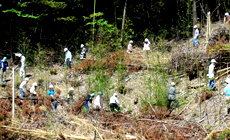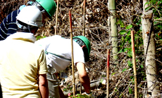 At "NTT West Midori Ippai Shionoe no Mori" in Kagawa, members have been engaging in activities to restore natural forests with biodiversity since 2014 by cutting down bamboos and planting wild cherries (yamazakura).