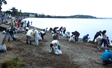 It was drizzling on the day of the event. Participants carried out the cleaning activities in the rain, and sorted garbage that was collected into combustible wastes, non-combustible wastes, driftwood and algae.