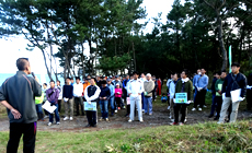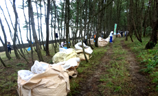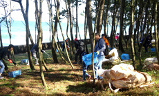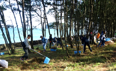 Although the event was on the verge of being canceled as it had been raining since the previous day, the sun showed its face at the time the event started. Participants took part in activities including branch picking, pine-needle raking and grass cutting to protect the pine trees from weevils. The activity was held with support from "Satohama-tunagi-tai," a network formed by the local residents who engage in the pine forest conservation activities of the local region. At the same time, cleaning of Fukui Beach, which is next to the pine forest, was also held. A beautiful scenery, as suggested by the common saying of "white sand, green pine," came into view at the end of the conservation activity.