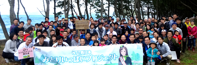 On October 29, 2016 (Saturday), a total of 122 employees and family members of NTT West Fukuoka Group participated in the fifth round of the pine forest conservation activity at Fukui Beach (Fukuoka Prefecture, Itoshima City, Nijo-Fukui).
