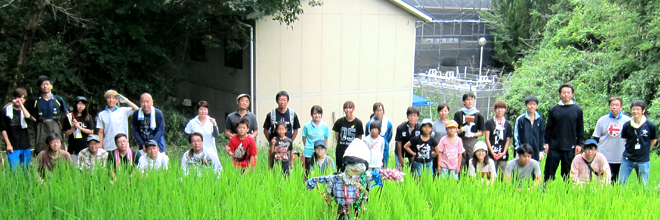 Participants engaged in rice planting at the previous activity on June 12 (Sunday). A total of about 35 participants, including employees and family members of Nara Group and other group companies as well as students of Kindai University, took part in this event where they made scarecrows to be installed at the fields and carried out grass and plant trimming as part of the effort to maintain the environment around the pond where the Japanese rosy bitterling inhabits.