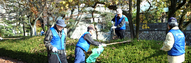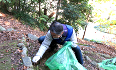 Participants from the respective companies put on uniform jackets and were assigned to one of the six areas. Everyone was drenched in sweat as they engaged in activities such as preparing leaf mold for conserving the forest by collecting fallen leaves and scattering them in the forest and picking up litter at the resting areas and sightseeing facilities.