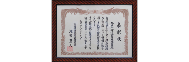 In recognition of our tree planting activities at the Sakai 7-3 district industrial waste disposal site since FY 2010, which helped to improve the environment of Osaka Bay, NTT West Group was recommended by the Osaka Prefecture Port Authority to Kinki Regional Development Bureau and was awarded the "FY 2016 Kinki Regional Development Bureau Director's Award" by Kinki Regional Development Bureau (Ministry of Land, Infrastructure, Transport and Tourism).