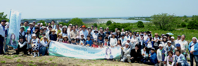 A joint effort by the residents, NPOs, corporations, governments and other groups, NTT West Group has been taking part in the maintenance of the "Forest of Symbiosis" since January 2011. This is an activity to plant trees in an area of about 100 hectares inside the Sakai 7-3 district industrial waste disposal site to create an environment that enables animals and plants to live on the true power of nature.