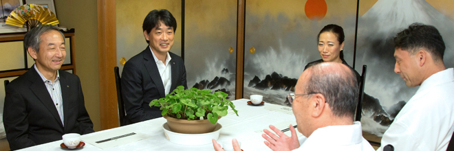 After the planting event, we invited Chief Priest Mr. Yasuhiro Tanaka and Priest Mr. Mitsutaka Inui from Kamigamo Shrine for a dialogue with NTT West representatives Mr. Yoshihiro Kuroda (Senior Executive Vice President), Mr. Yasuyuki Sasaki (Manager of Kyoto Branch) and Ms. Minako Hara (Manager of Environment Management Promotion Section) on the global environment protection activities of NTT West Group as well as the role that it plays in the regional community.