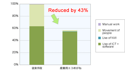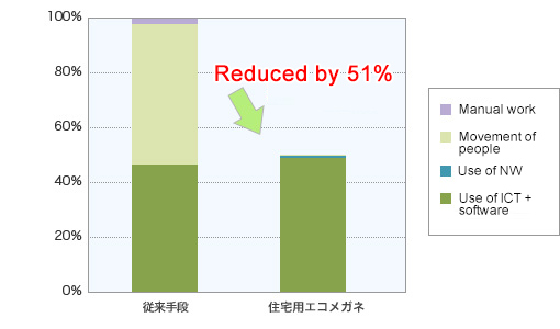 When a comparison is made between the use of "Eco Megane" with that of the traditional system, the amount of reduction in CO2 emission achieved is 43% per year in the case of a corporate entity, and 51% in the case of a household.