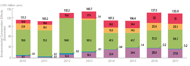 Environmental conservation (economic) effects for FY 2017 reached 13.3 billion yen, which fell below the result of FY 2016.