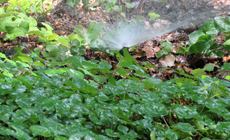 Sprinklers that were installed last year to water the hollyhocks came in extremely handy this year, making the wet leaves of the newly-planted hollyhocks glisten vibrantly.