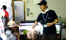 A briefing on the objectives of the activity was given by Associate Professor Kitagawa (Environmental Management Department, Faculty of Agriculture, Kindai University), which was followed by a tour to the mini satoyama aquarium run by the students. Although the aquarium was small in scale, the participating children stared intriguingly at the fish tanks and got really excited when they touched the turtles. They also listened attentively whenever Associate Professor Kitagawa started to explain the different types of fish.