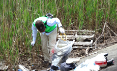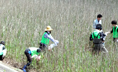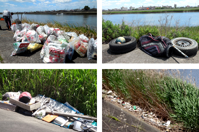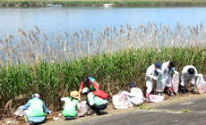 Following instructions by the secretariat leader, participants split into three groups and moved to the cleaning area to pick up litter such as plastic bottles and empty cans from drinks that were washed ashore. They also plowed through the reeds that were as tall as them to clear up garbage that was scattered far inside. In about 90 minutes' time, piles of garbage were built up along the levee.
