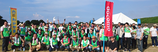 On July 23, 2017 (Sunday), NTT West Wakayama Group participated in the "Kinokawa River Mass Cleaning" activity organized by the Ministry of Land, Infrastructure, Transport and Tourism.