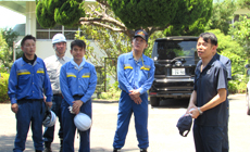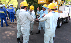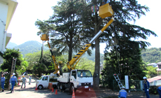 The participants were then divided into groups to hold a KYT (Kiken Yochi Training or Risk Prediction Training) before starting work. A total of seven vehicle-mounted work platforms and four lightweight trucks were used for the pruning and cleaning works. Utmost priority was given to ensuring safety such as by lowering branches and leaves that were pruned off using a rope, while careful attention was also paid to avoid heatstroke. The activity, which lasted for about two hours, helped to enhance the visibility of the school route.