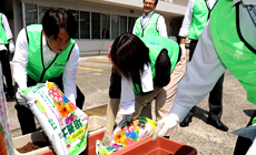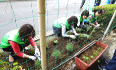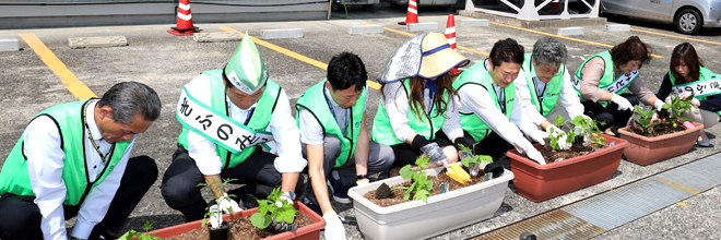 At Kano Building, participants challenged planting of blue morning glory, a type of creeper plant. Meanwhile, periwinkles, which are able to withstand exhaust gas and air pollution, were planted in the flowerbeds in addition to fragrant herbal plants that are also expected to have a therapeutic effect.